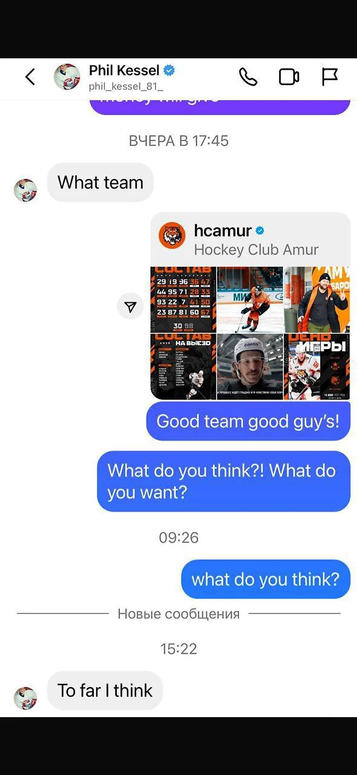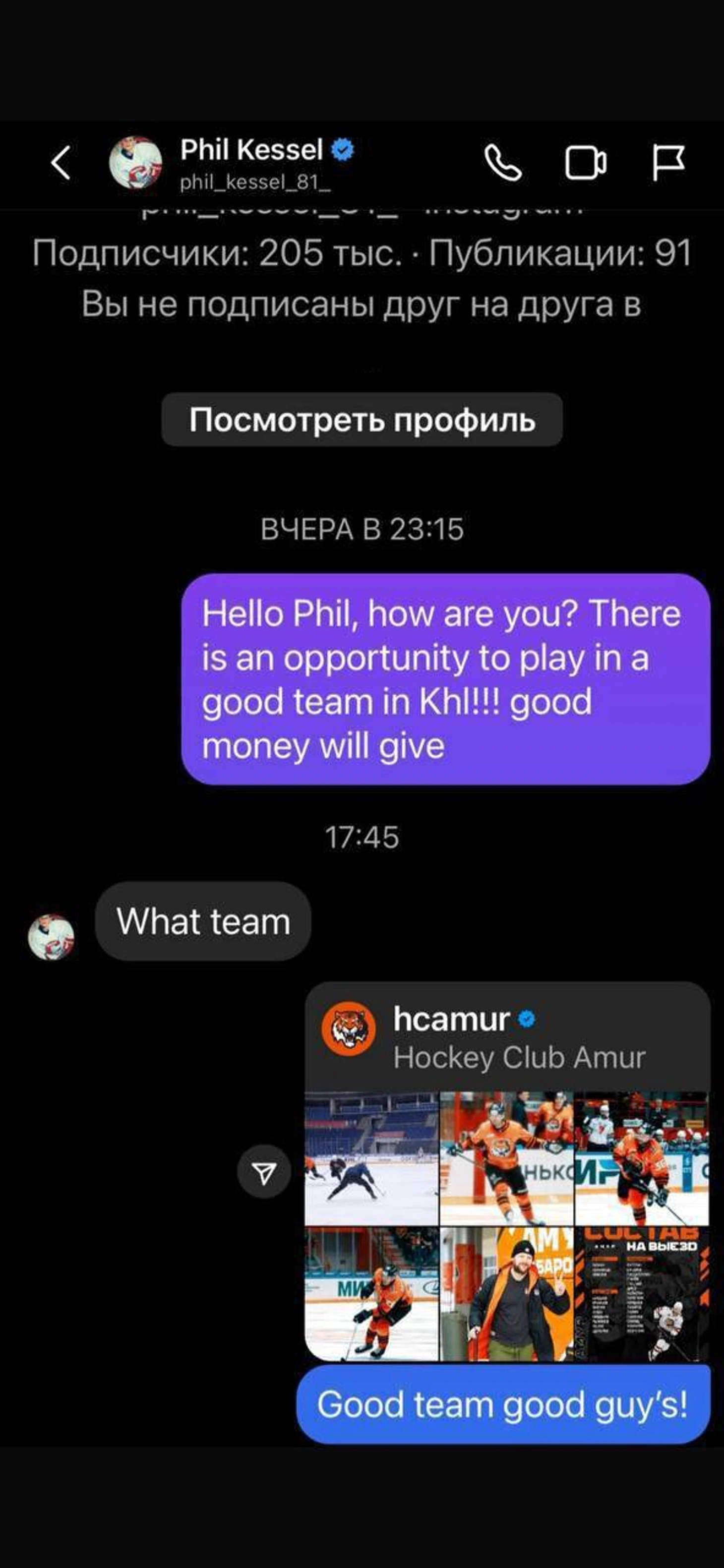 • Дмитрий Шевченко приглашал Кессела в «Амур» в соцсети в 2023-м. Трехкратный обладатель Кубка Стэнли ответил: «Слишком далеко»