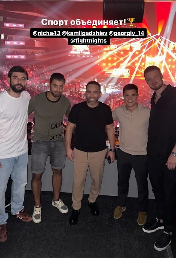 Ничушкин и Нагорный сфотографировались с экс-защитником футбольного «Спартака» Георгием Джикией и главой Fight Nights Global Камилом Гаджиевым.