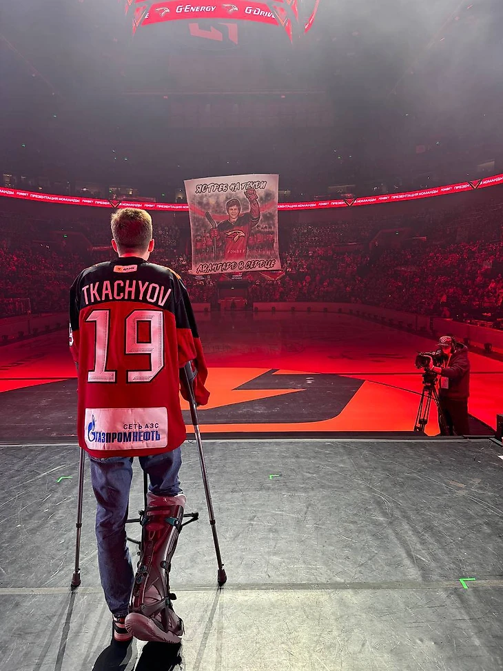 Нападающий «Авангарда» Марк Верба опубликовал фото с Ткачевым, стоящим на костылях перед болельщиками, которые держат плакат с лозунгом: «Ястреб на груди, «Авангард» в сердце».