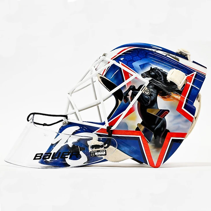 Павел Мойсевич из СКА показал новый шлем с изображением коня.