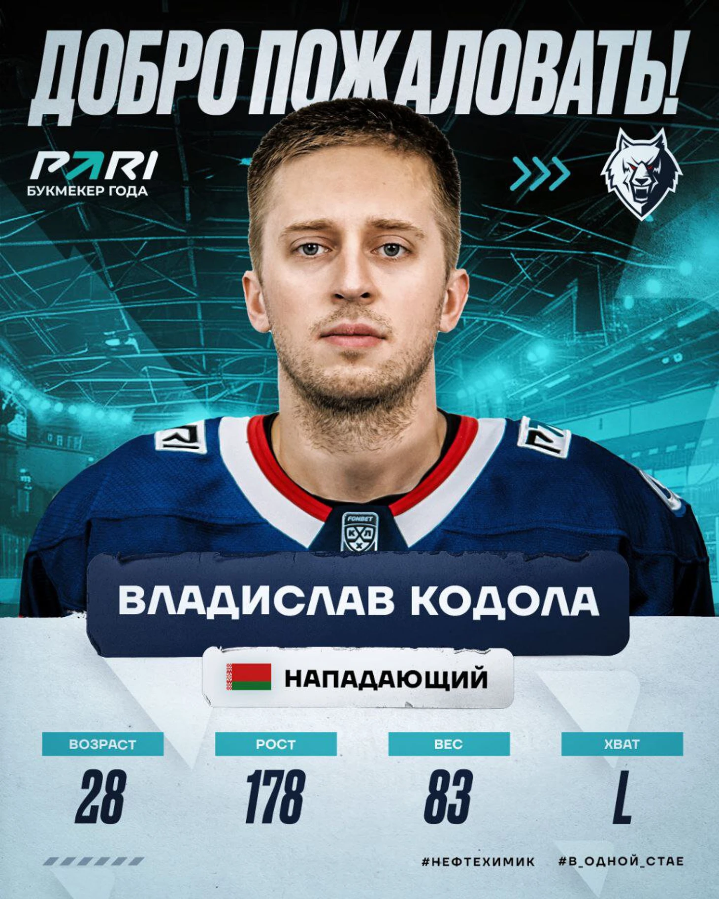 Сегодня «Нефтехимик» объявил о заключении пробного контракта с Кодолой, который является воспитанником гомельского хоккея.