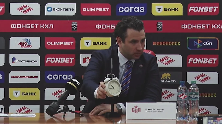 Ротенберг подарил будильник Зислису на пресс-конференции после 4:3 со «Спартаком». Журналист «СЭ» назвал его «трофеем от самого медийного человека КХЛ» и разыграет среди подписчиков