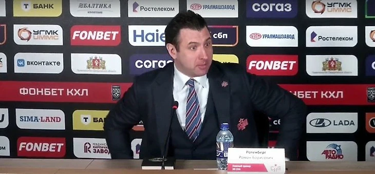 Во время послематчевой пресс-конференции журналисты вручили главному тренеру петербуржцев Роману Ротенбергу подарки.