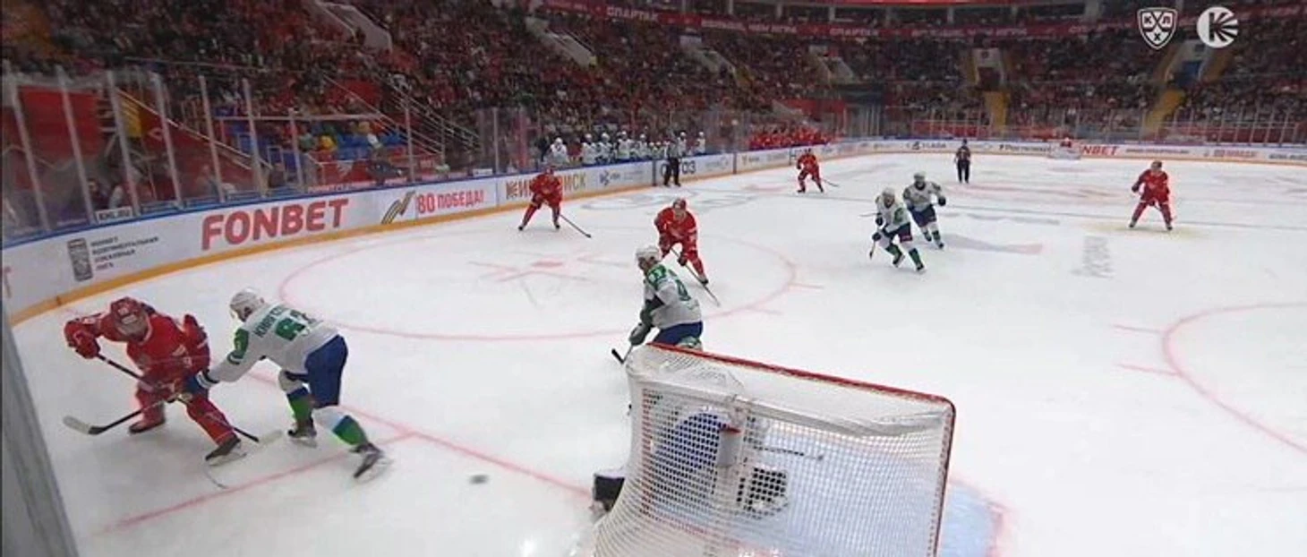 На 12-й минуте форвард «Спартака» Егор Филин забил гол прямым броском от лицевого борта.