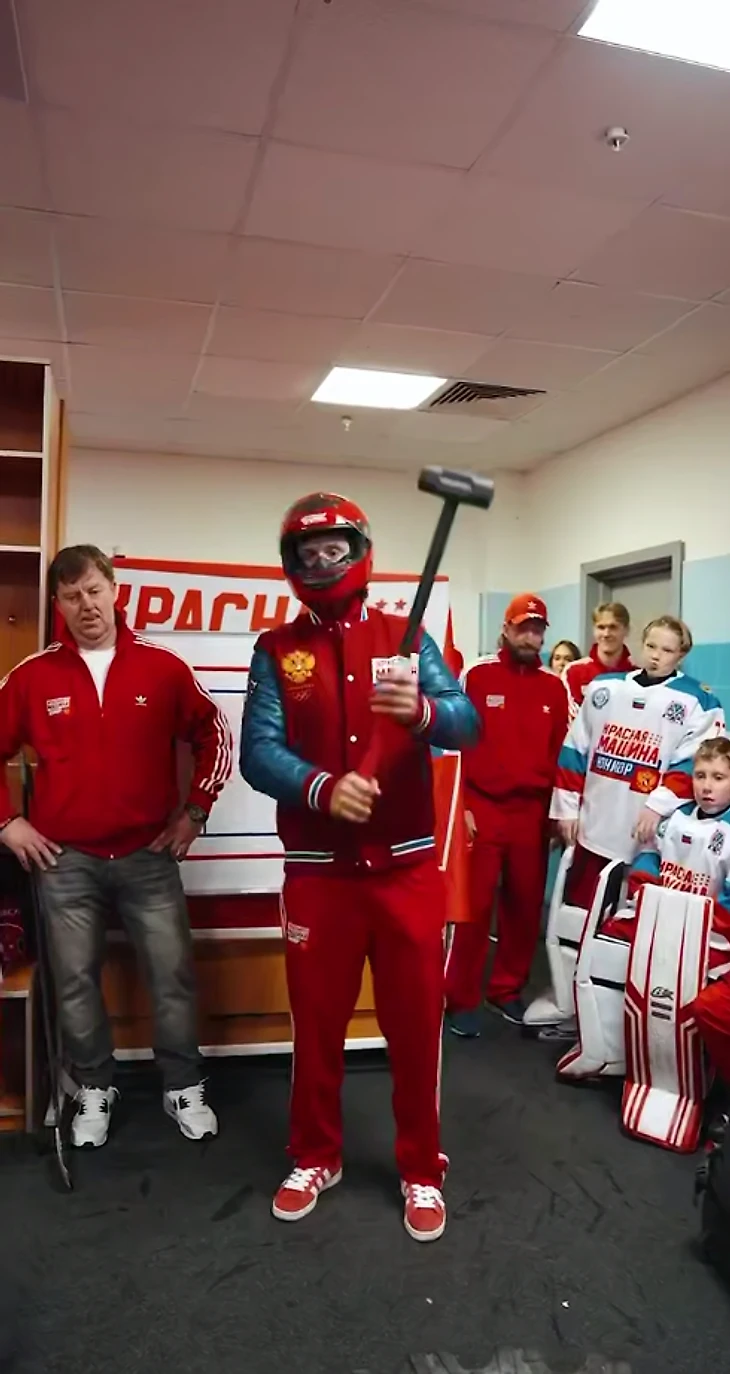 Ротенберг вручил шлем «Формулы-1» и цепь лучшему игроку матча в «Красной Машине Юниор» и 6 раз ударил кувалдой по шине: «Сколько забили, столько раз бьем в колесо победы»