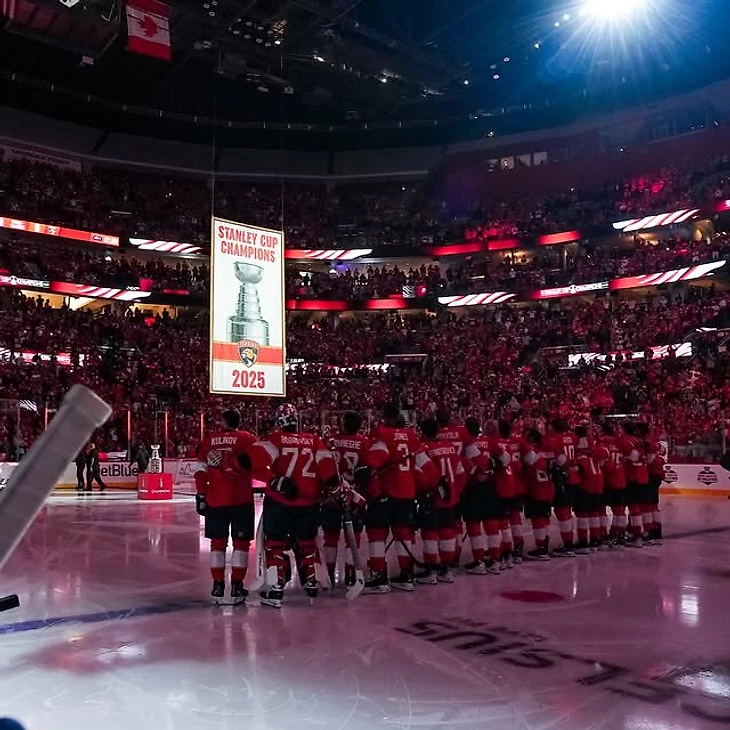 «Флорида» подняла чемпионский баннер в честь 2-й победы в Кубке Стэнли за 2 года. Болельщики на арене скандировали: «Мы хотим третий!»