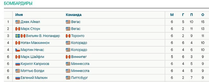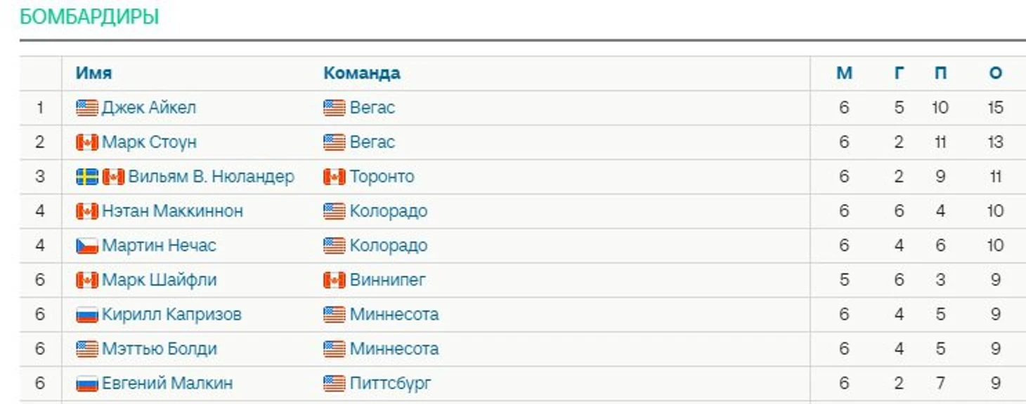 • Айкел набрал 0+4 в матче с «Калгари», Стоун – 2+2. Форварды «Вегаса» идут на 1-м и 2-м местах в гонке бомбардиров НХЛ с 15 и 13 очками после 6 игр