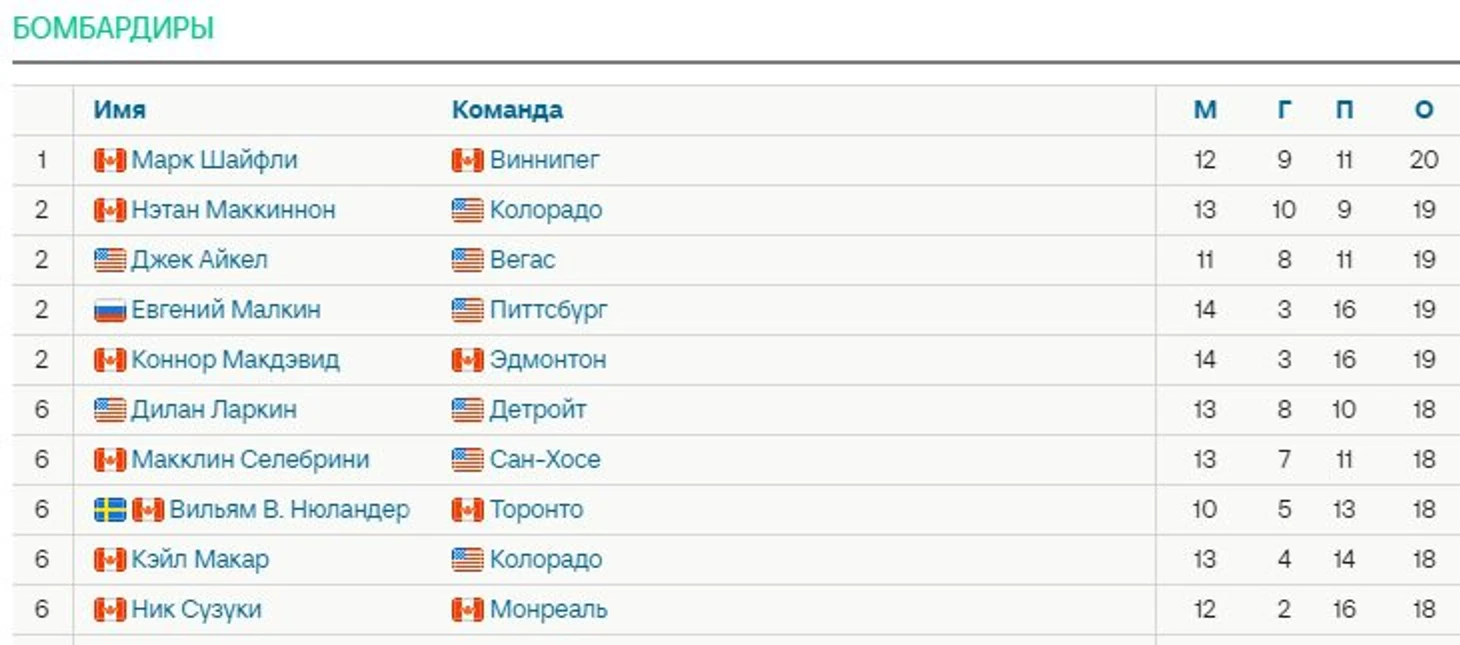 Макдэвид и Малкин догнали Маккиннона и Айкела в гонке бомбардиров НХЛ и делят с ними 2-е место – у всех по 19 очков. Лидирует Шайфли с 20 баллами