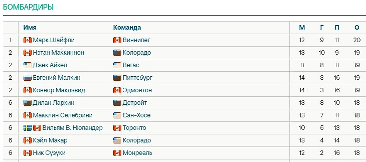 Лидирует форвард «Виннипега» Марк Шайфли («Виннипег», 20 в 12, 9+11).