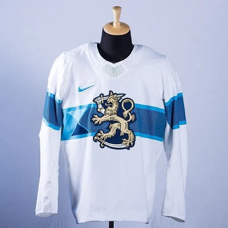 Сборная сохранила традиции: на обоих комплектах (белом и синем) в центре изображен герб Финляндии – коронованный золотой лев, его правая передняя лапа заменена рукой в доспехе, держащей серебряный меч с золотой рукоятью. Лев попирает задними лапами серебряную сарацинскую саблю с золотой рукоятью.