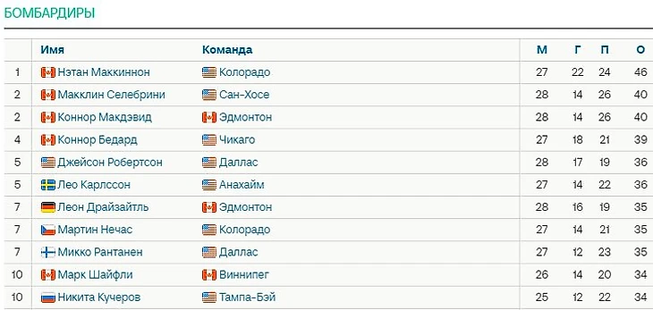 Лидирует в гонке форвард «Колорадо» Нэтан Маккиннон, сегодня оставшийся без очков в матче с «Айлендерс» (3:6). У 30-летнего игрока 46 (22+24) баллов в 27 играх.
