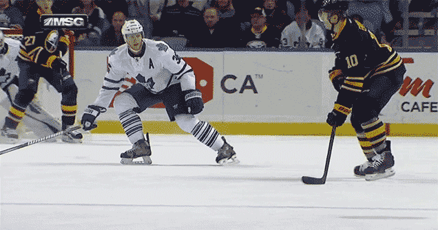 После броска Кристиана Эрхоффа шайба прошла прямо сквозь конек защитника «Торонто».