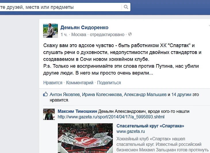 P.S. Только не воспринимайте эти слова против Путина, нас убили другие люди. В него мы просто очень верили… – написал Сидоренко на своей странице в Facebook.