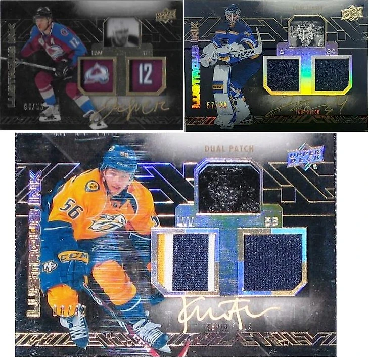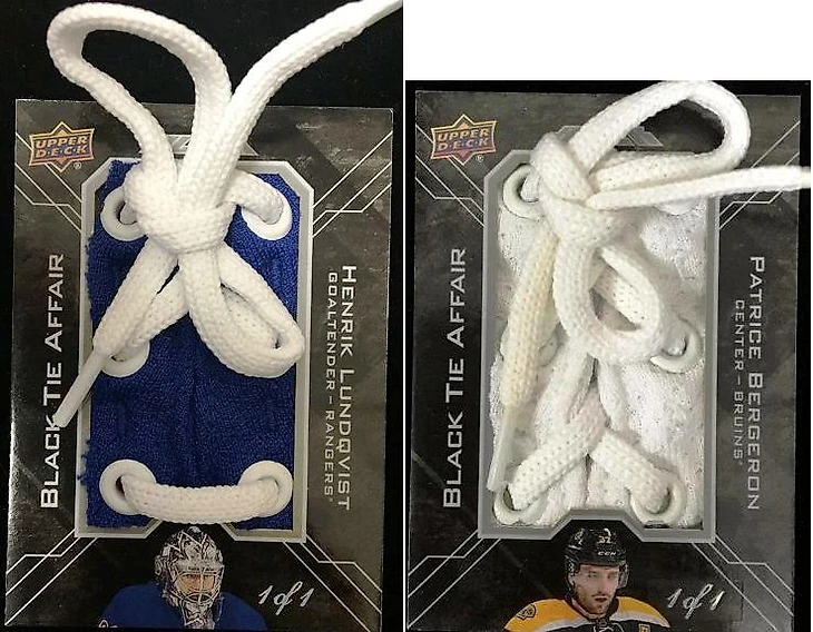 Наконец-то Upper Deck выпустил карты со шнуровками со свитеров. Удивляет, что карт не много - всего 68 шт. Шнуровок должно было накопиться больше... Сомневаюсь, что производитель их выбрасывал. В блоке попадаяются редемпшен-картонки, которые можно поменять у производителя на сами карты. Т.к. фотки уже доступны, то долго ждать обмена не придется.