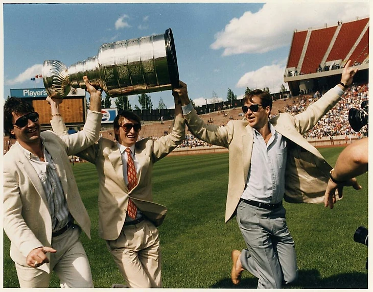 Уэйн Гретцки, Кевин Лоу и Пол Коффи с Кубком Стэнли на бейсбольном стадионе.