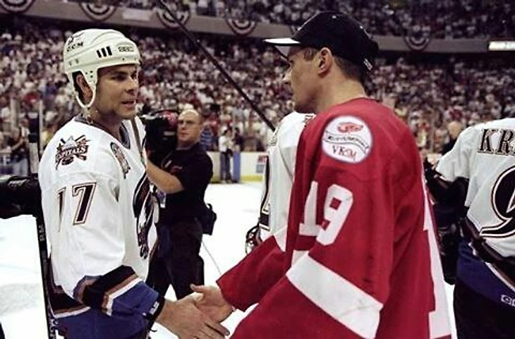 Рукопожатие Адама Оутса и Стива Айзермана после финала Кубка Стэнли в 1998 году.