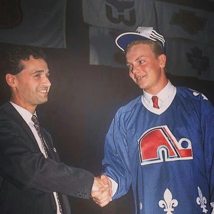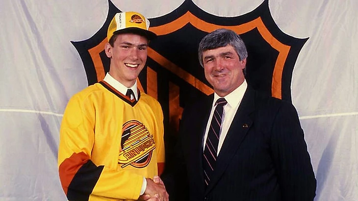 Тревор Линден - 2-й общий выбор и Пэт Куинн на драфте НХЛ. 11 июня 1988 года.