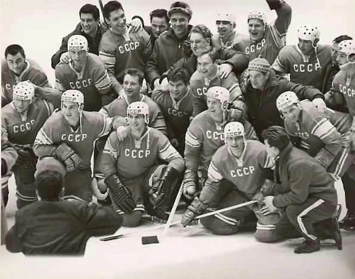 Чемпионское фото сборной СССР после победы на Олимпиаде-1964 в австрийском Инсбруке. В финальном матче советская сборная одолела сборную Канады со счетом 3:2.