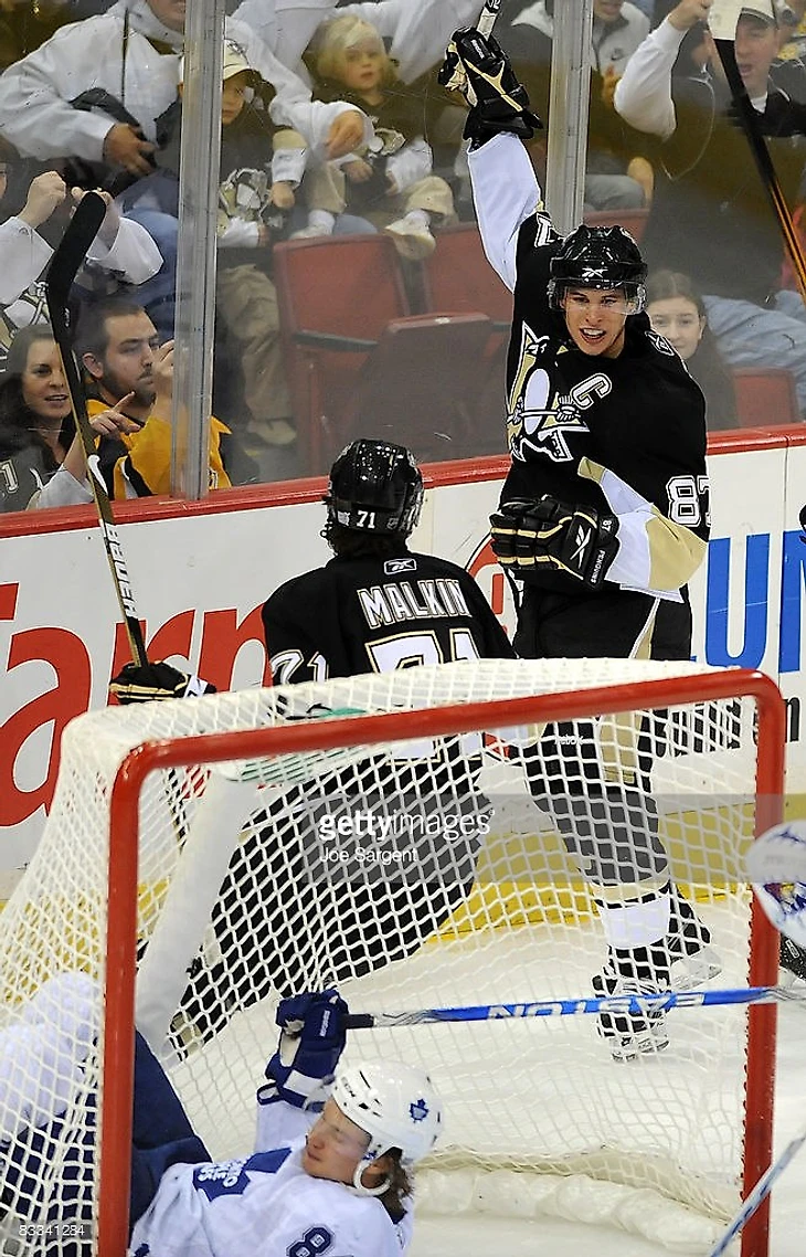 Евгений Малкин и Сидни Кросби празднуют 100-й гол Кросби в НХЛ.