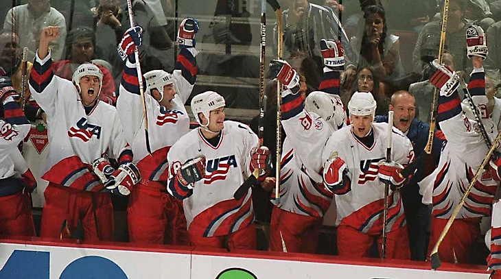 14 сентября 1996 года. Скамейка сборной США празднует победу в третьем матче финала (5:2) и итоговую победу на Кубке мира в 1996 году над сборной Канады.