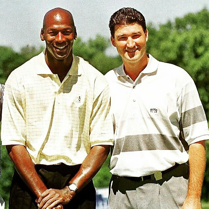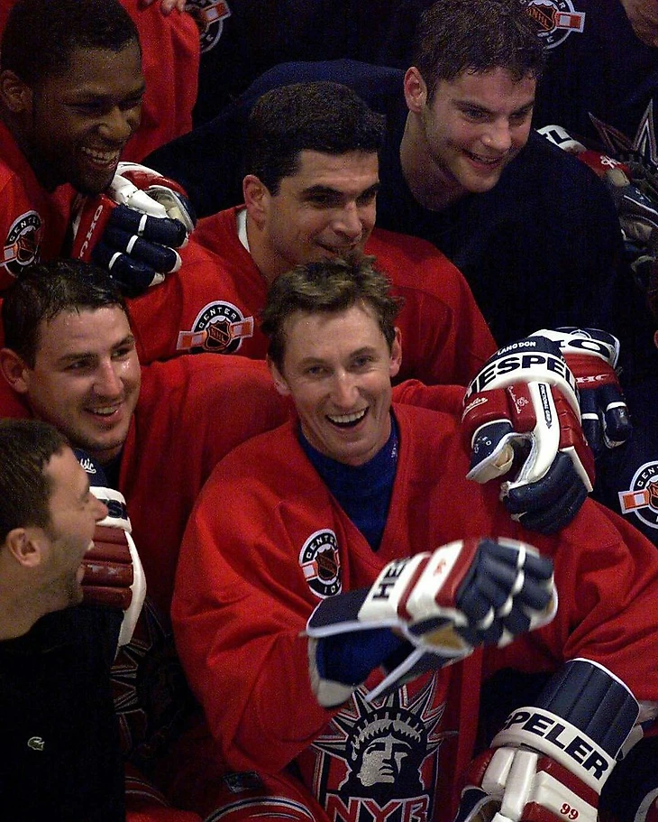 Уэйн Гретцки на последней тренировке в карьере с партнерами по «Рейнджерс». 18 апреля 1999 года.