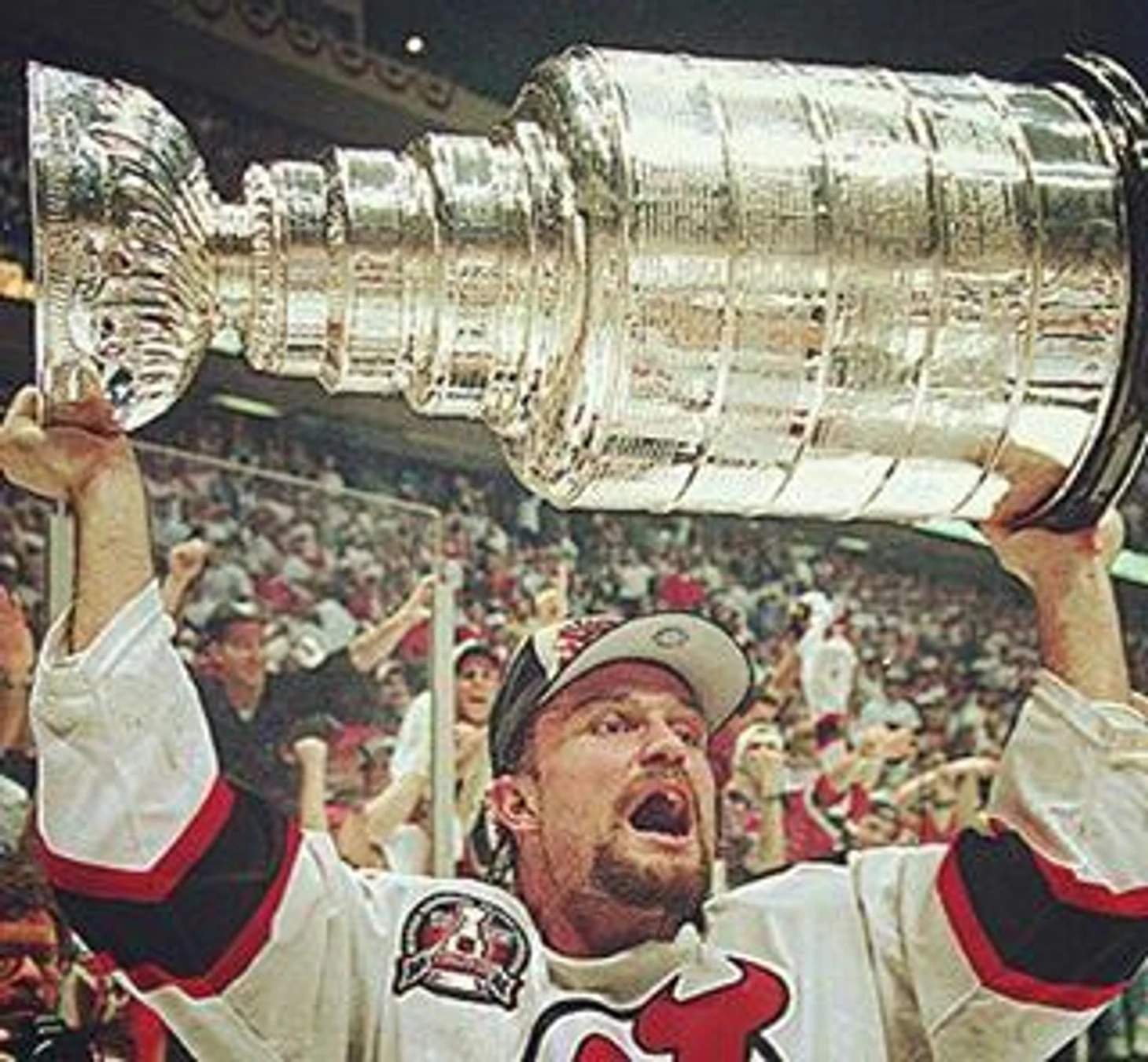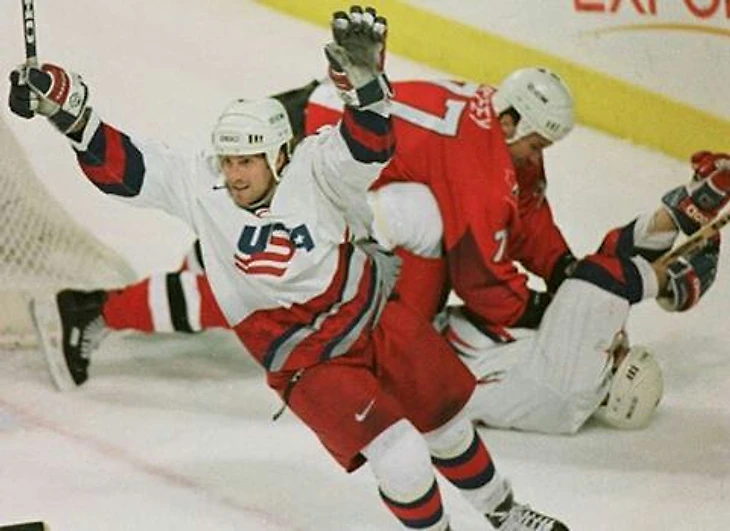 Тони Амонти празднует победную шайбу, заброшенную в третьем матче финала Кубка мира-1996 со сборной Канады.
