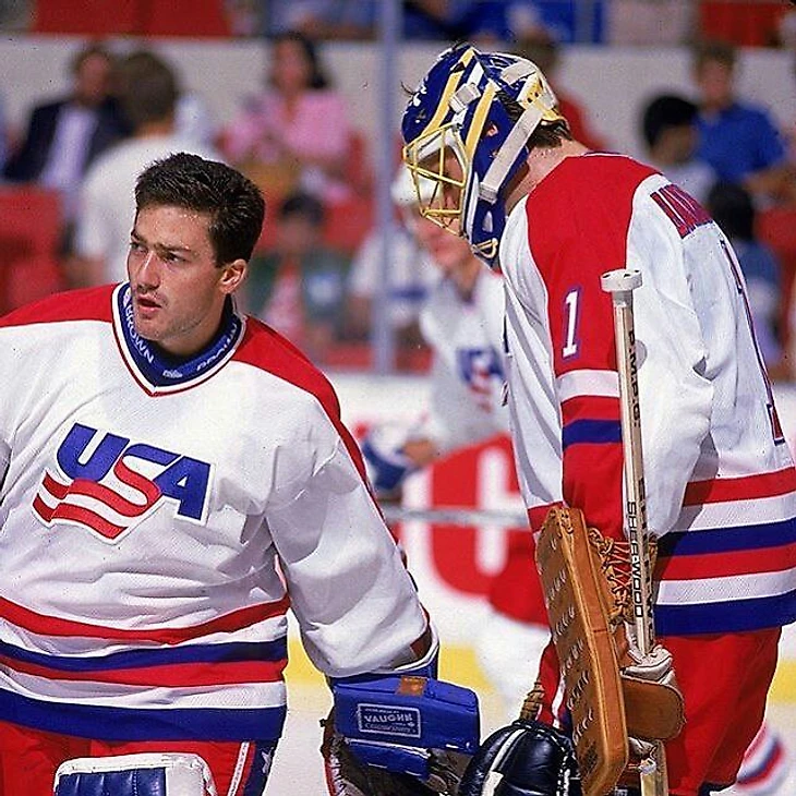 Голкиперы Том Баррассо и Джон Ванбисбрук перед матчем сборной США на Кубке Канады. 1987 год.