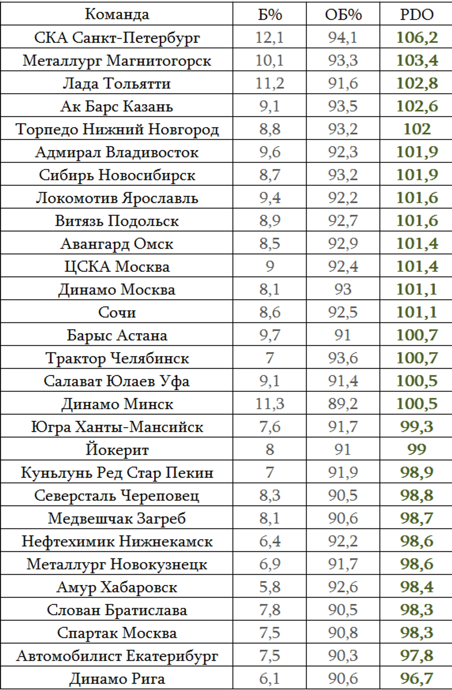 Таблица 4: Показатель PDO (реализация бросков в створ + процент сэйвов вратаря)