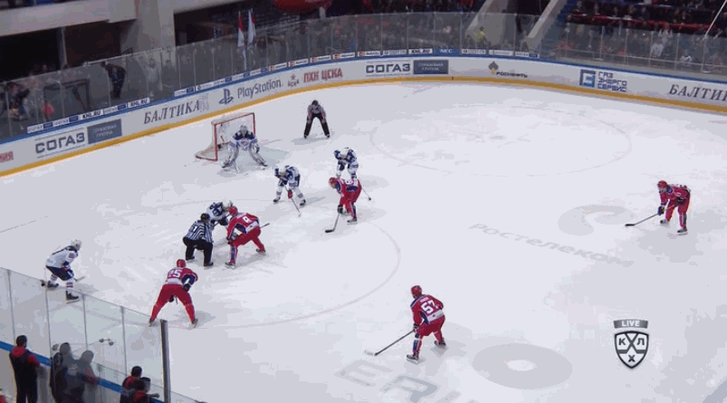 ЦСКА вообще хороший пример того, как нужно работать на вбрасываниях. Вот в своей зоне важнее сыграть надежно — защитник Никита Зайцев сразу бежит за спину своему центрфорварду, на подбор. А нападающий Игорь Макаров за спину сопернику, чтобы побороться на шайбу, если вбрасывание будет проиграно.