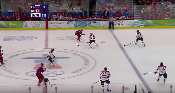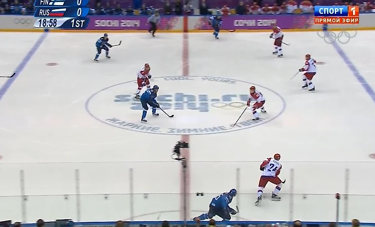 Пассивная система игры — наш любимый классический откат, который в чистом виде уже мало кто практикует. При потере шайбы четверка игроков в линию откатывается на свою синюю, где встречает соперника с целью не дать себя обыграть, один нападающий на красной линии отбивает атаку на один из флангов. Чтобы ни говорил Зинэтула Билялетдинов, скриншоты не врут — его олимпийская сборная самый яркий пример такого хоккея. Это чистые 1-4 (демократичный вариант — 1-1-3).