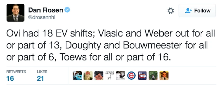 Наложениями называют ситуации, когда под определенное звено/игрока одной команды тренер другой специально выпускает одного игрока, связку, пару защитников или целое звено. Это проще провернуть команде хозяев, которая имеет право выпускать свой состав позже гостей, но есть куча технологий, как это сделать, если ты играешь в гостях (например — выпустить смешанную тройку и после вбрасывания поменять одного-двух игроков). Цель наложения — устроить выгодные тебе противостояния, чтобы, например, твои лучшие играли против худших игроков соперника. Эту историю непросто иллюстрировать с помощью видео, поэтому тут нам поможет вот такой твит об игре Овечкина в полуфинале КМ-2016: