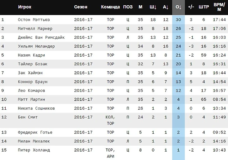 Фантастическая молодежь собирается в команде: невероятный плеймейкер (на самом деле он ту-вей форвард) - Остон Мэттьюз, который уже наколотил 18 шайб. Стоит упомянуть (для любителей сравнивать Мэттьюза и Лайне), что столько очков Остон набрал играя в звене не с ведущими оффенсив игроками команды, а с чекером - Заком Хаймэном. Есть много статей про Мэттьюза, в которых его хвалят, я лишь добавлю - Остон лидер по всем показателям в Торонто, учитывая, что он весь сезон играет в 3 (изредка во 2) звене...
