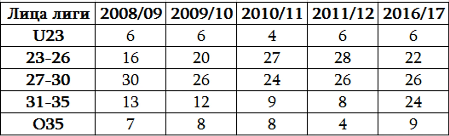 Как лучше всего продемонстрировать это снижение? Воспользуемся «светофор-анализом» лиц лиги – возьмем трех лучших бомбардиров среди нападающих от каждого клуба и разобьем их по пяти возрастным интервалам и трем подкатегориям: «зеленая» группа – условно «Молодость» (до 26 лет), «желтая» группа – «Расцвет сил» (27-30 лет) и «красная» группа – условно «Ветераны» (более 31 года). Результаты ужасают: