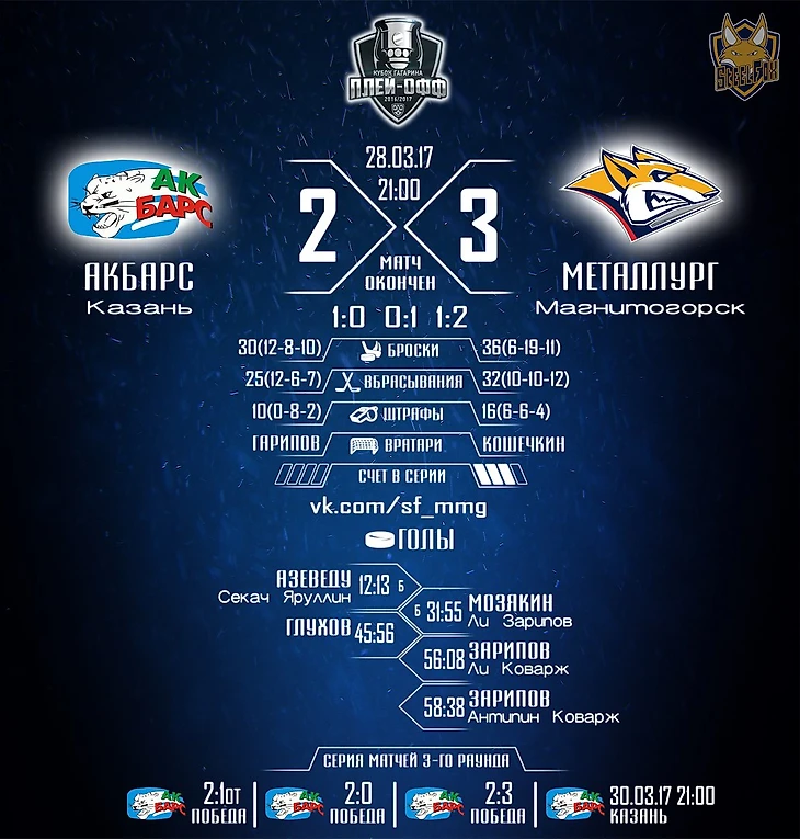 3-0 в серии. Осталась всего одна победа. Сейчас сложно предположить, какую игру продемонстрируют команды послезавтра. Точнее, непонятно, как поведет себя "Акбарс", потому что "Металлургу" на данный момент кардинально ничего менять не надо. А вот казанцам, после такого обидного поражения(два раза вели в счете, потратили уйму сил и эмоций) наверняка будет не просто настроиться на последний бой.