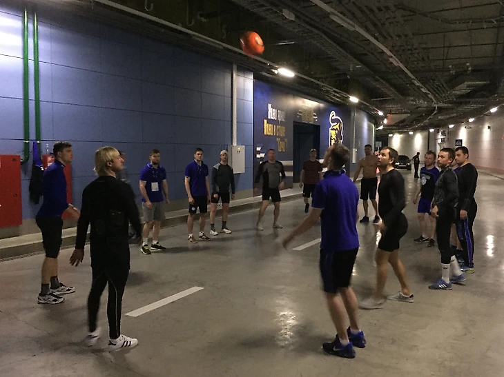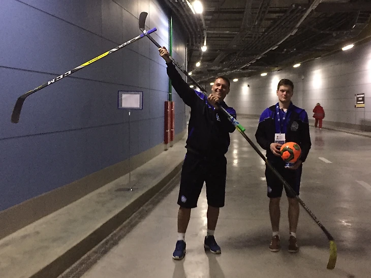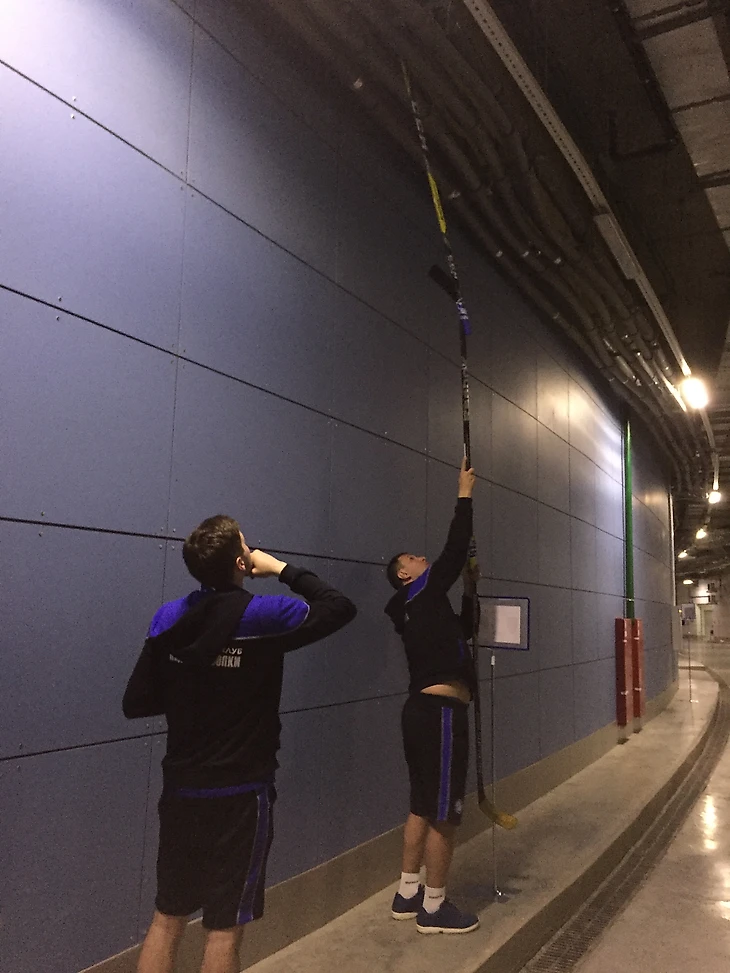 Затянувшаяся разминка наконец была остановлена вмешательством случайного обстоятельства: мяч застрял над проводами. Выручать команду пришлось игрокам, не попавшим в заявку на эту игру, но не потерявшим креативность и ловкость: склеив три клюшки им удалось достать важный трофей команды.