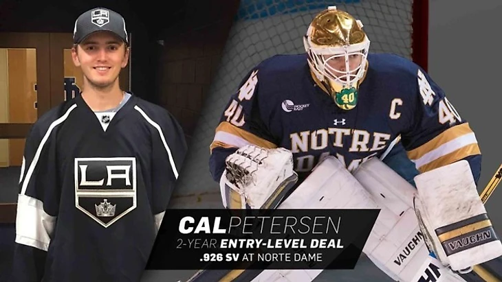 Как и ожидалось, голкипер университета Нотр-Дам Кэл Петерсен также стал новичков «королей». Он подписал 2-летний контракт новичка. Думаю, у него тоже есть минимальный шанс побороться в тренинг-кэмпе за звание сменщика Куики, но, по-моему, лучше Кэлу начать набираться опыта в АХЛ. Также есть вариант, что он начнет сезон в лиге Западного побережья, где будет получать много игрового времени, а не сидеть на скамейке. Тоже не самая плохая идея, пусть и не самая привлекательная для игрока.