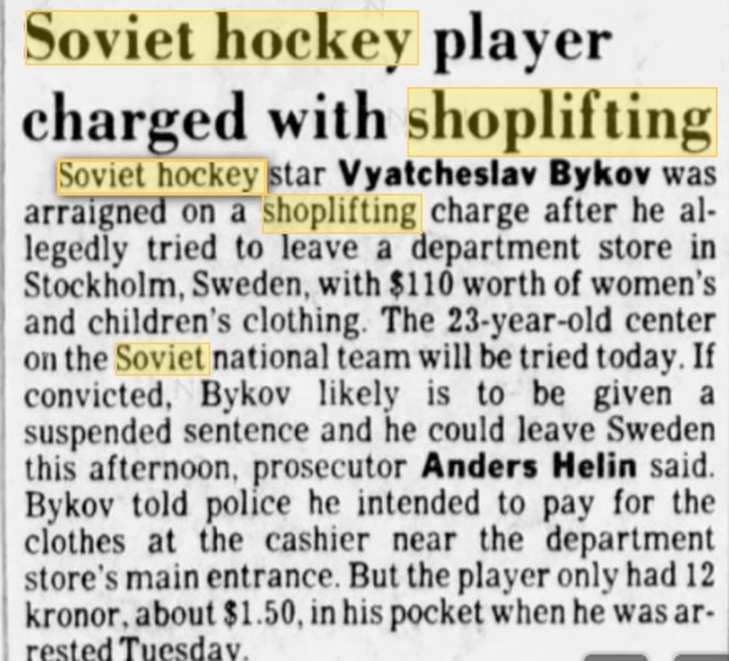 С шведскими властями хоккеисты сборной Союза сталкивались не в первый раз. В апреле 1981-го Владимир Петров гонял на спорткаре по Гетеборгу, преследуемый полицейскими машинами, но его карьера подходила к концу, и то дело замяли. Случай Быкова отличался. При даче показаний он сказал, что является профессиональным спортсменом и зарабатывает на жизнь игрой в хоккей, и публично признался в том, что подозревали многие – любителей в сборной СССР не было. Быков также озвучил свою зарплату – четыре тысячи рублей в год или пять тысяч долларов по официальному курсу на 1983 год.