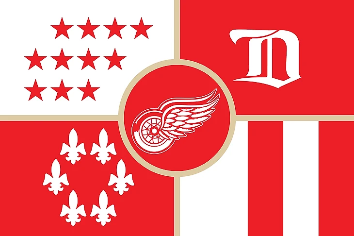 В этом флаге история «Ред Уингс» вписана во флаг города Детройта. В центре – нынешний логотип. В правом верхнем углу – Д-логотип, оставшийся в наследство от «Кугарс». В правом нижнем – число 26 (год основания клуба) в двоичном формате (11010, где 1 – белый цвет, 0 – красный, прим. перев.).