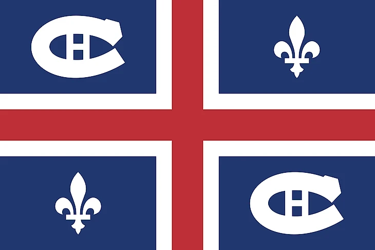 Здесь сочетание крестообразных конструкций с флагов города Монреаля и провинции Квебек дополнено монохромными логотипами «Канадиенс».