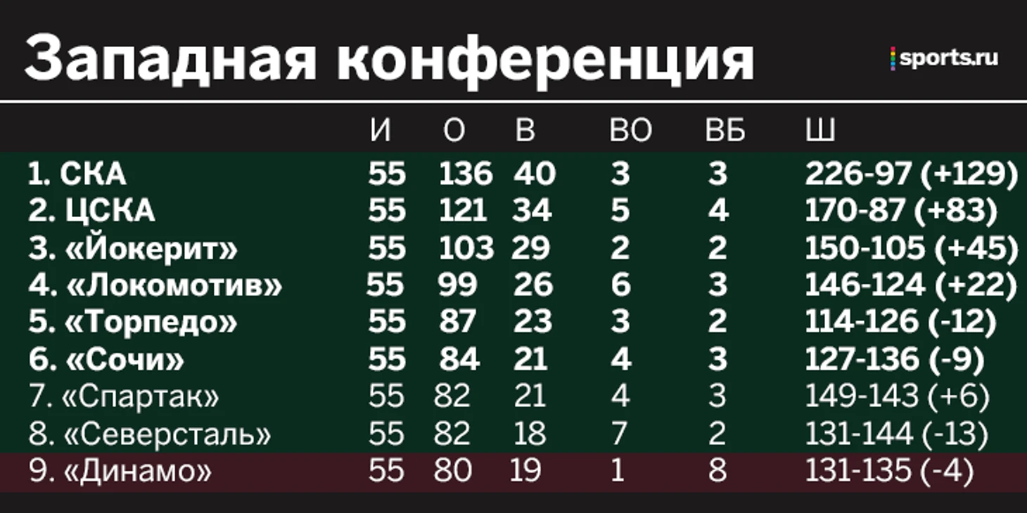 13.00 В таблице Западной конференции ситуация тоже запутана от слова «совсем». «Спартак» и «Динамо» в очном матче сегодня решат, кто выходит в плей-офф – но крайней в этой ситуации может оказаться «Северсталь», если не обыграет СКА в Питере, а бело-голубые возьмут три очка.