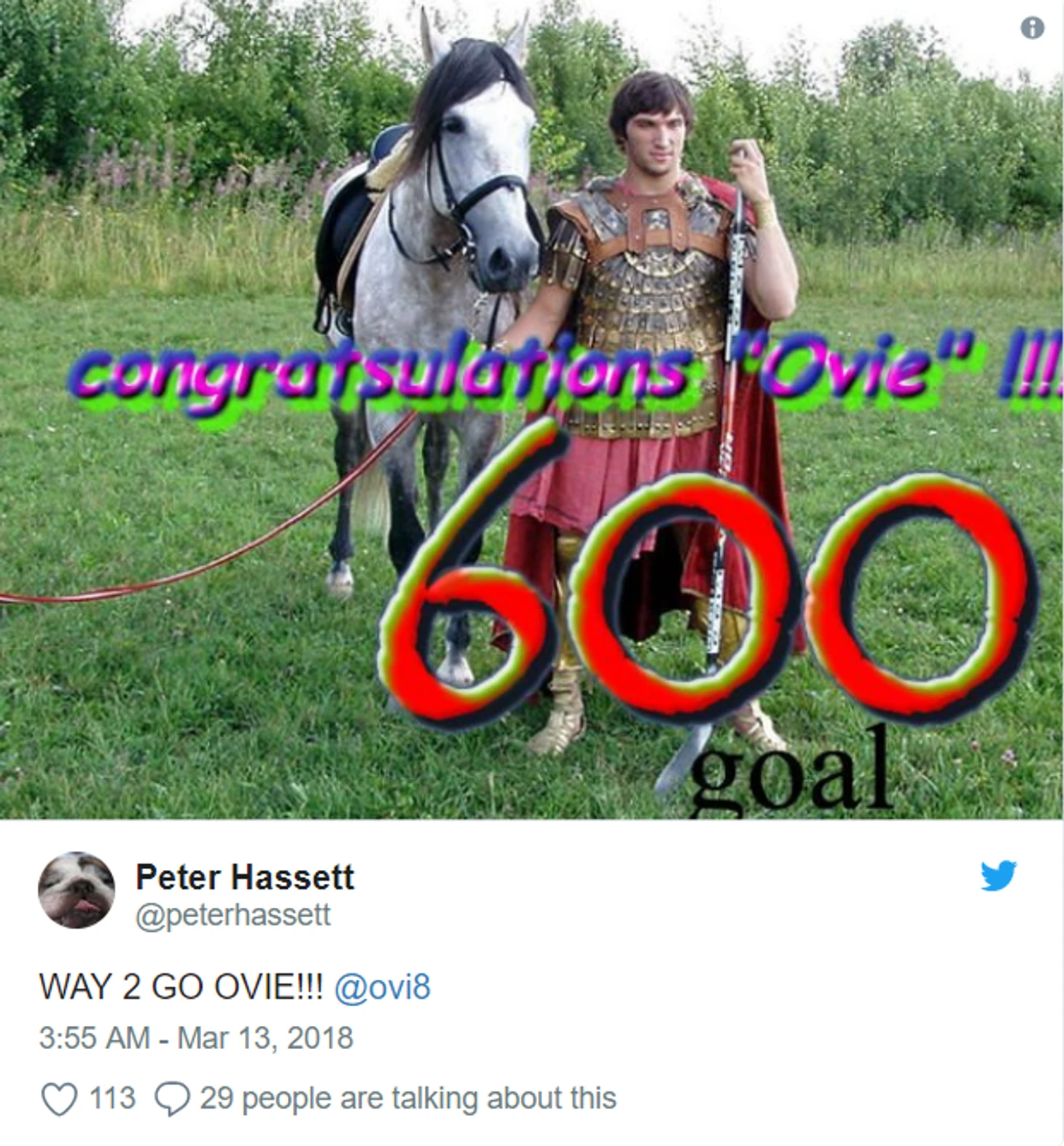 - Когда «Кэпиталз» задрафтовали Ови, думаете они могли подумать, что 600 голов это реально? За менее чем 1000 матчей? Я не удивлюсь, если они предполагали, что он обладает таким уровнем потенциала, но сомневаюсь, что кто-нибудь когда-нибудь мог бы биться об заклад на сей счет… а то, что он добился такого в современную эпоху, делает его достижении еще более впечатляющим. Ови – это действительно лучшее, что когда-либо происходило с «Кэпиталз», и мы, болельщики, никогда не должны воспринимать это как должное. Спасибо тебе, Ови!