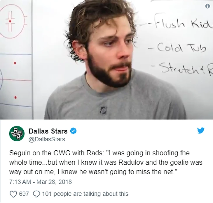 «Когда Александр Радулов забил гол в овертайме, подарив команде победу, ложа прессы затряслась от невероятного шума, который издавали верные поклонники «Старз». Это было чувство огромнейшего облегчения – для всех людей на арене, а не только для парней на льду».