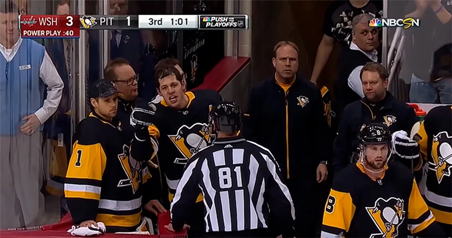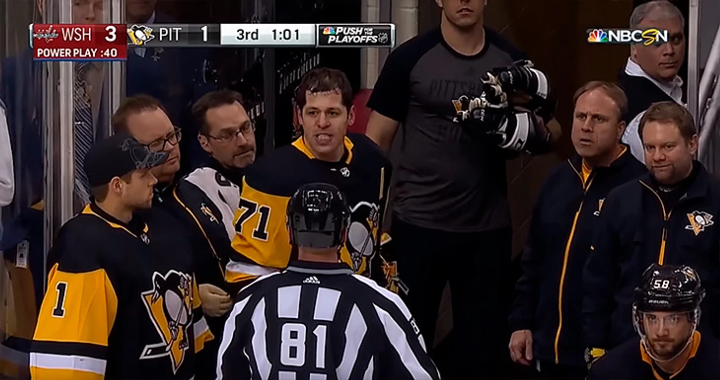 На предпоследней минуте игры Евгений Малкин выбросил клюшку Ти Джея Оши на скамейку «Вашингтона», за что получил от ее владельца удар в спину – так и началась их борьба. За всем этим с бортика «Кэпиталс» наблюдал Евгений Кузнецов, готовившийся выйти на смену.
