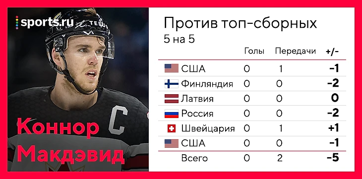 – С латышами провалилась вся Канада – за 60 минут забили латышам лишь раз, при этом Кристерс Гудлевскис особо не старался – атака соперника была чудовищно предсказуемой и скучной. Макдэвид забросил шайбу в том матче и принес канадцам победу – но это случилось в овертайме, а хоккей «3 на 3» – это все же немного другой вид спорта;