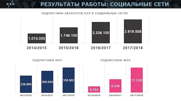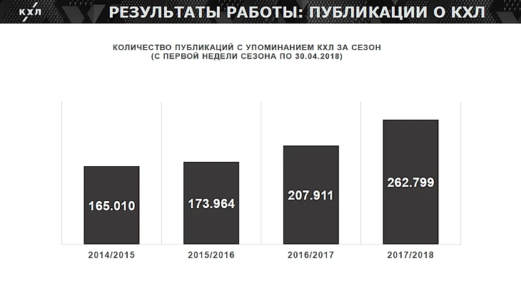 Согласно нашей статистике, количество упоминаний о Лиге в прессе в завершившемся сезоне составило 262,8 тысячи, а число подписчиков аккаунтов КХЛ в социальных сетях достигло 2,6 миллиона. По обоим показателям мы демонстрируем уверенный прогресс — за последние три года публикаций о КХЛ в пересчете на один сезон стало на 100 тысяч больше, а армия фолловеров Лиги в соцсетях выросла более, чем вдвое. Неплохие результаты, несмотря на несколько сокращенный в связи с Олимпиадой регулярный чемпионат, мы продемонстрировали и в плане посещаемости — в общей сложности на матчи КХЛ в завершившемся сезоне пришло больше 5 миллионов зрителей, причем заполняемость арен на играх регулярки составила в среднем 73,4 процента, а в плей-офф — без малого 90.