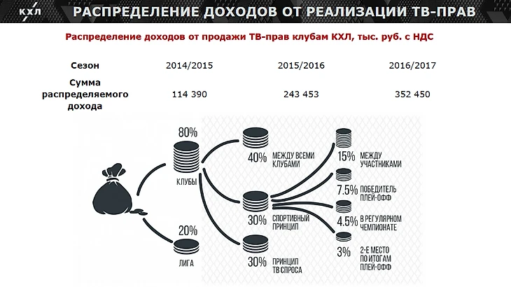 Впервые мы распределили телевизионные деньги по итогам сезона 2014/2015 — тогда речь шла о 114,4 миллиона рублей. С тех пор эта сумма постоянно увеличивалась — в сезоне 2016/2017 КХЛ выплатила 352 миллиона рублей (с учетом НДС).