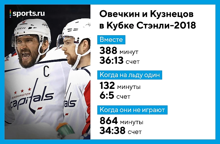 Да, эти цифры принимают такой сумасшедший вид благодаря тому, что Овечкин и Кузнецов много играют в большинстве и совсем не защищаются в меньшинстве. Но даже в равных составах статистика поражает: 18:9 по голам в пользу «Вашингтона», когда они на льду, и 29:25 без российских форвардов.
