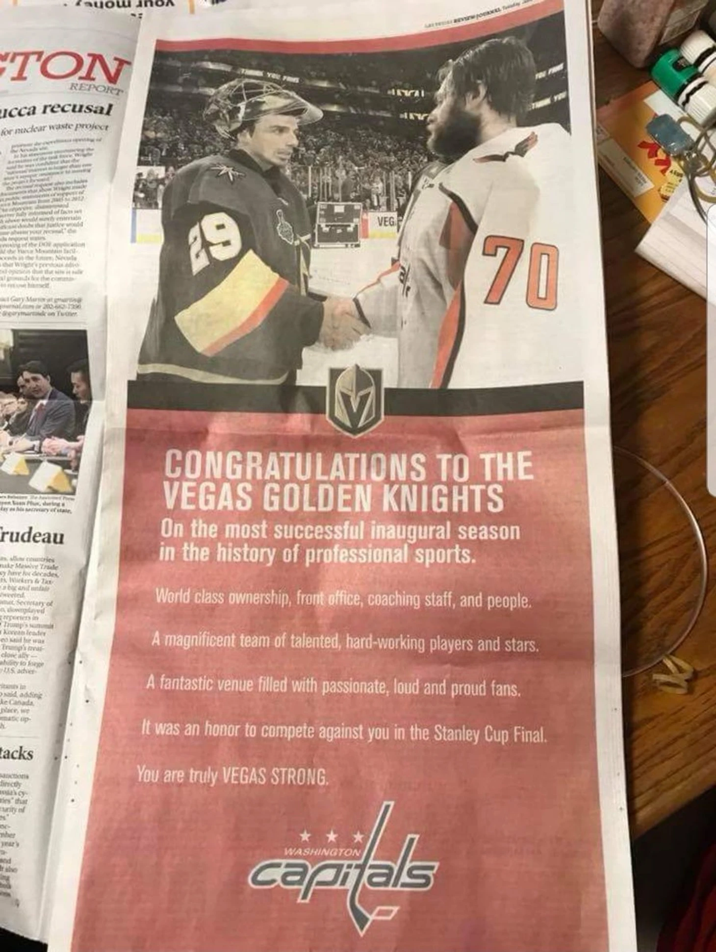 Клуб «Вашингтон Кэпиталз» выкупил разворот в одной из газет Лас-Вегаса, чтобы поздравить клуб «Вегас Голден Найтс» с успешным дебютным сезоном в НХЛ. Напомним, в финале Кубка Стэнли «Вашингтон» победил «Вегас» со счётом 4-1, впервые в своей истории взяв главный трофей НХЛ. «Поздравляем „Вегас“ с самым успешным дебютным сезоном в истории профессионального спорта», — указано в заголовке газетного разворота.