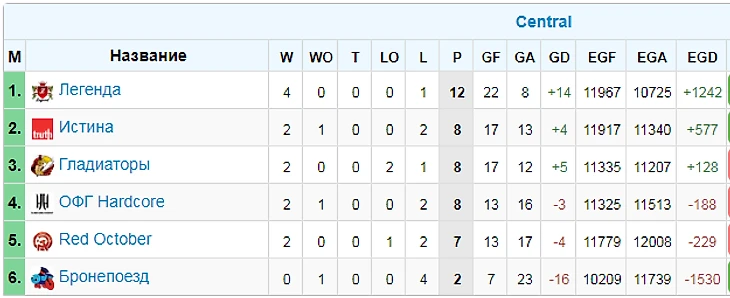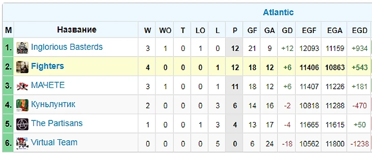 Как и ожидалось фавориты дивизиона Inglorious Basterds, ведомые одним из лидеров ОЗ Alex 1988, закончили первый круг на первом месте, допустив лишь две ничьи и одержав три победы. Неожиданно хорошо провели 1-й круг и Файтеры, одержавшие 4 чистые победы. В группе лидеров дивизиона и МАЧЕТЕ, одержавшие три победы. А вот Партизаны наверняка ожидали лучшего старта, а не только одной победы, одержанной над аутсайдерами. Скорее всего есть элемент невезения и во втором круге у Партизан дела пойдут лучше.