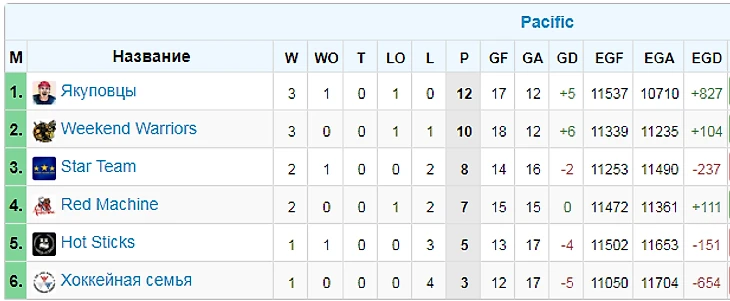 Якуповцы с небольшим отрывом лидируют в дивизионе. Хорошо стартанули и Воины. Молодцы и новички турнира Star Team, пришедшие в себя после двух поражений и одержавшие затем три победы. Ужасно стартанула Хоккейная Семья, проигравшая первые 4 встречи. Надеюсь, что столь опытная команда сможет выправить положение во втором круге.